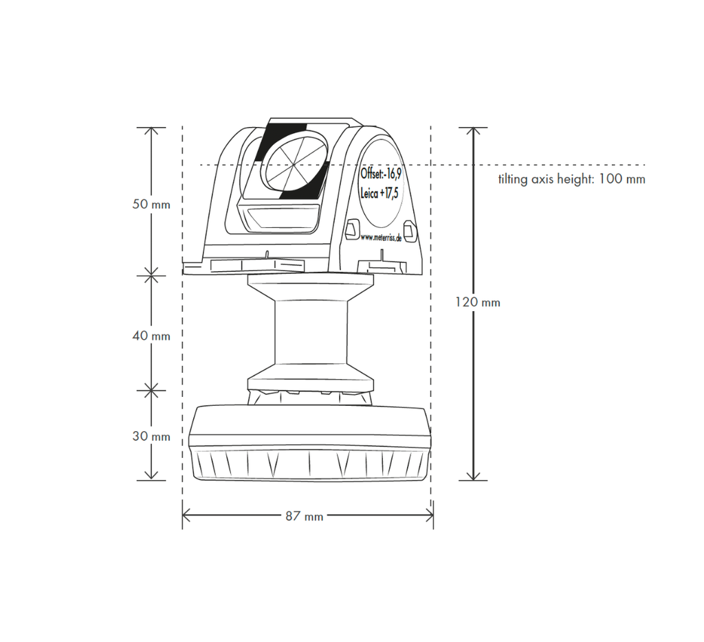The Mini Prism RSMP395M has a tilt axis height of 100 mm, thus enabling the exact calibration of the following reference points by means of a total station:
